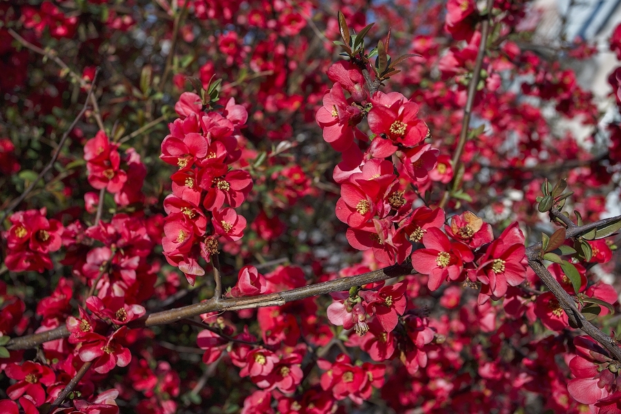 Японская айва цветет обильно, обычно в конце весны или начале лета. В это время куст становится особенно привлекательным и выступает одним из главных украшений сада. В остальное время года он не так выделяется среди других растений: крупный, раскидистый, густой, образующий либо аккуратную стриженую форму, либо живописные заросли.