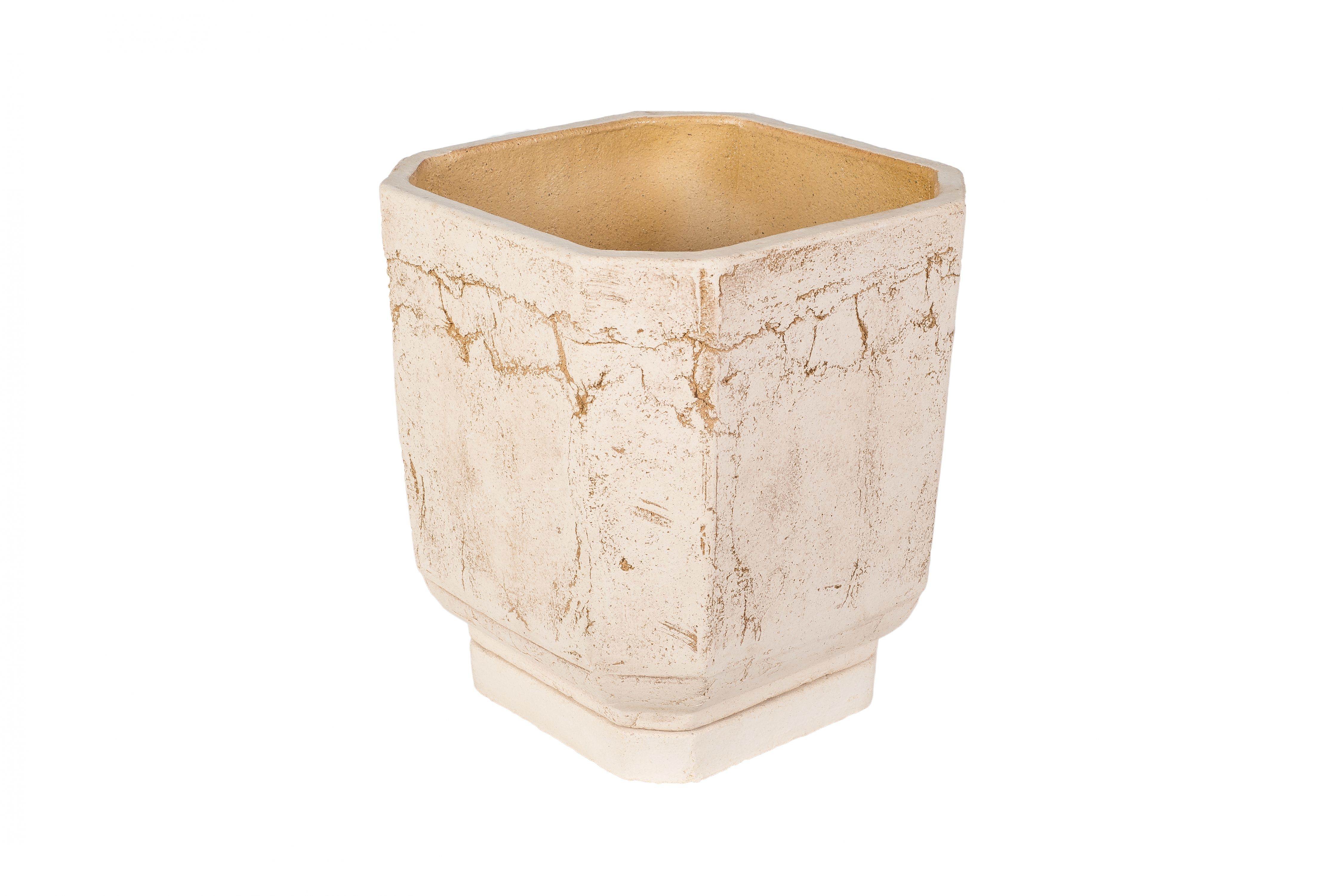 Цветочный горшок изготовлен из шамотной глины высокотемпературного обжига. Изнутри покрыт специальной кварцевой глазурью. Выполнен в бежевом цвете. Декорирован узорами из линий, имитирующими лёгкие трещинки под старину. Горшок по форме напоминает квадрат - колокол со скошенными углами.