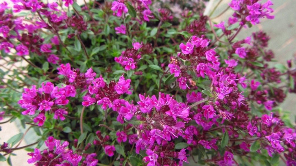 Тимьян ползучий – это многолетняя садовая культура, широко используемая в ландшафтном дизайне. Полукустарник с ветвистыми, стелющимися по земле стеблями образует густой зеленый ковет. Мелкие овальные листики чередуются с небольшими фиолетово-красными цветочками, собранными в ложные мутовки.